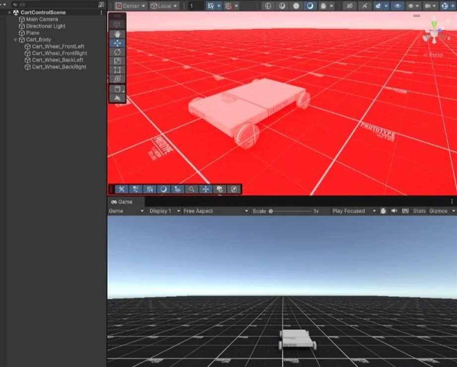 • Decided to follow a tutorial's modular approach: a cart body with 4 wheels. At first glance, the structure made sense – forces on each wheel (suspension, torque, acceleration/braking) – but honestly, I wasn’t sure how these pieces would interact. Are the wheels just visual? Is raycasting involved?